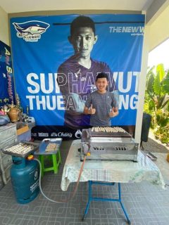 “ช่วงนี้ผมว่างจัดจริงๆ หลังจากที่ไม่ได้ซ้อมและต้องเก็บตัวอยู่แต่ในบ้าน ก็มีเพียงโปรแกรมฟิตเนสช่วงเช้า เย็น และมีวิ่งออกกำลังกายบ้าง แต่เวลาที่เหลือมันว่างจริงๆ ก็คิดว่าน่าจะหาอะไรทำ ก็เลยทำลูกชิ้นปิ้งดีกว่า เพราะที่บ้านก็เคยทำมาก่อน ซึ่งลูกชิ้นของผมมี 2 แบบคือหมูล้วน กับเอ็นหมู ส่วนใหญ่ก็จะวิ่งส่งตามบ้านที่มีคนสั่งเข้ามา เพิ่งขายวันแรกครับ ก็มีออเดอร์เยอะที่โทรมาสั่ง หรือไลน์มา เราก็วิ่งไปส่งให้จะกี่ไม้ก็ส่งหมดครับถ้าไม่ไกลเกินไป” เทพอาร์ม กล่าวถึงธุรกิจใหม่ที่เพิ่งทำ